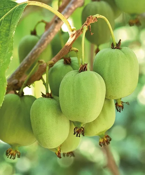 | Všeobecný text | Kiwi (Actinidia chinensis) je vůči zimě odolná popínavá liána, které se výborně daří jak na slunných, tak i neosluněných, teplých, proti větru chráněných stanovištích. Rostlina je dvoudomá, tzn. že pro tvorbu plodů je potřeba samičí a samčí rostlina. Jedna samčí rostlina postačí na pět samičích. Rostlina začíná plodit až když je plně vyvinuta - po 3 až 4 letech - na dvouletém dřevě. Plody kiwi jsou velmi bohaté na vitamím C a mohou se v chladničce při teplotě + 5 °C skladovat minimálně 4 měsíce.Kiwi Piccolo (Actinidia arguta) Toto kiwi můžeme vysazovat až do nadmořské výšky 600 m. Rostlina je až do - 30 °C absolutně mrazuvzdorná. Kiwi ´Piccolo´ je samosprašné, proto nám pro zajištění úrody postačí i jedna rostlina. |
