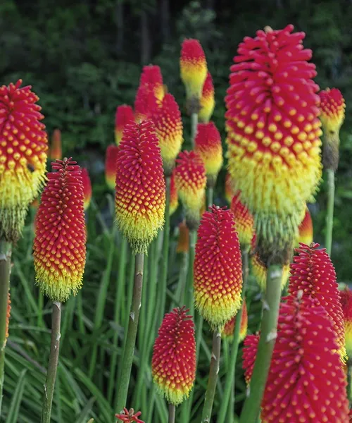 Kleopatřina jehla. Kniphofia. Tyto kouzelné květy se z dáli podobají svítícím rozžhaveným pochodním. Na stejném místě vydrží řadu let, pokud listy před zimou svážeme a kořeny přikryjeme chvojím.