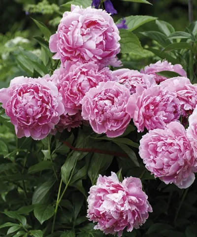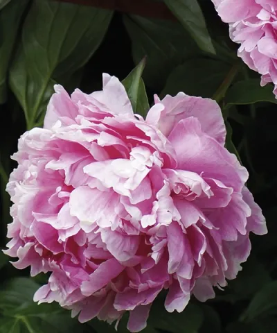 Paeonia lactiflora 'Sarah Bernhardt'. Hustý boharý květ se v plné kráse rozvine již ve třetím roce pěstování. Čím je rostlina déle na vhodném stanovišti, tím bohatěji kvete. Vhodná k řezu.