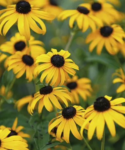 Rudbékie žlutá. Rudbeckia fulgida Goldsturm. Díky veselým žlutým květům s tmavým okem se hned rozzáří celá zahrada. Rychle se bohatě rozrůstá. Patří k nejbohatěji kvetoucím trvalkám vůbec. Výborná též k řezu do vázy.