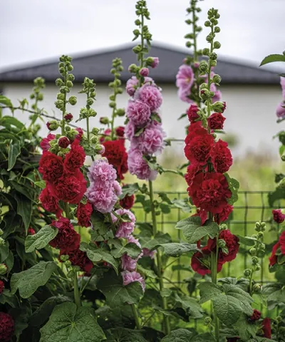 Slézová růže. Alcea Chater´s Hybrid. Husté, plné květy na dvoumetrových stvolech! Mrazuvzdorná, dvouletá, sama se dál vysemeňuje.