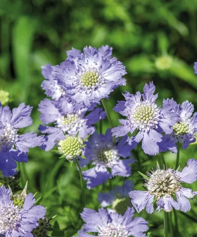 Scabiosa columbaria. Mnohokvětá luční trvalka s květy v levandulově modré barvě. Přitahuje motýly a bez problému nakvétá po celé léto až do začátku podzimu. Dobře roste na sušších osluněných místech a každý rok se více rozrůstá.