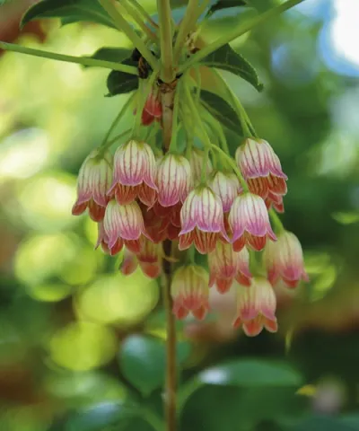 ´Zvonkovec´. Enkianthus campanulatus. Záplava květů tvaru lampiónků s červeným žilkováním. Upoutá i podzimní zbarvení listů, kdy se obléká do hýřivých podzimních barev. Sází se do půdy s příměsí rašeliny na mírně zastíněné místo. Mrazuvzdorný bez ochrany do -15 °C. Dodáváme v květináči.